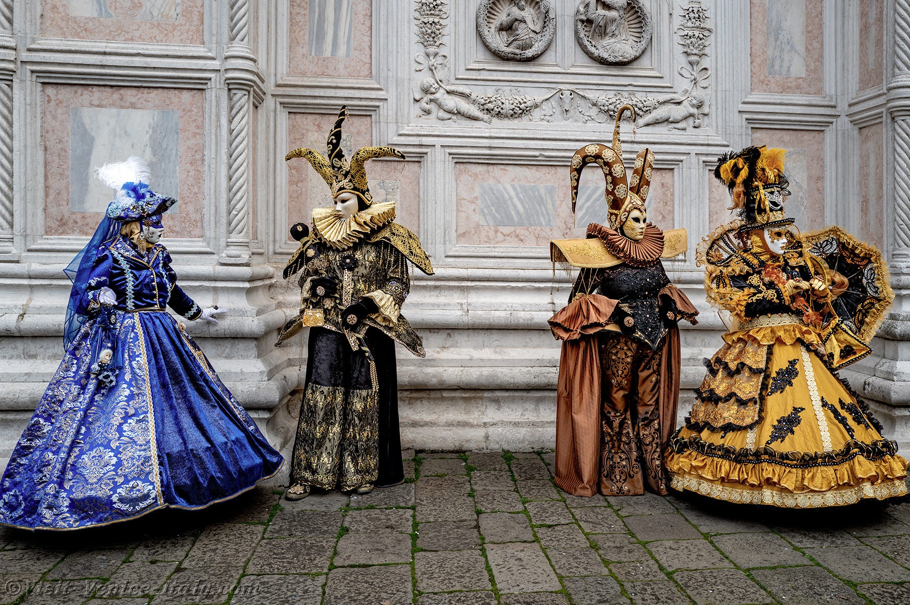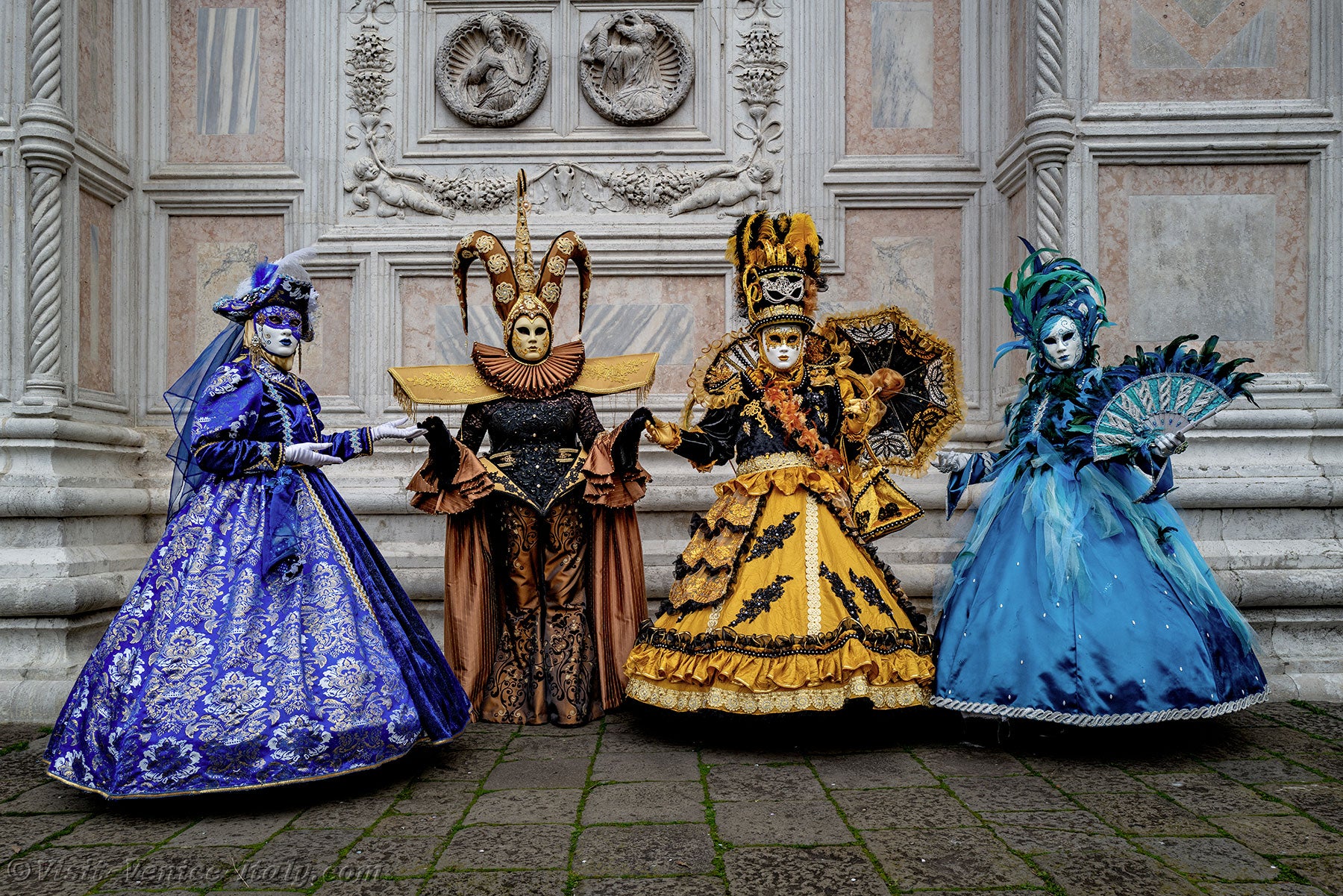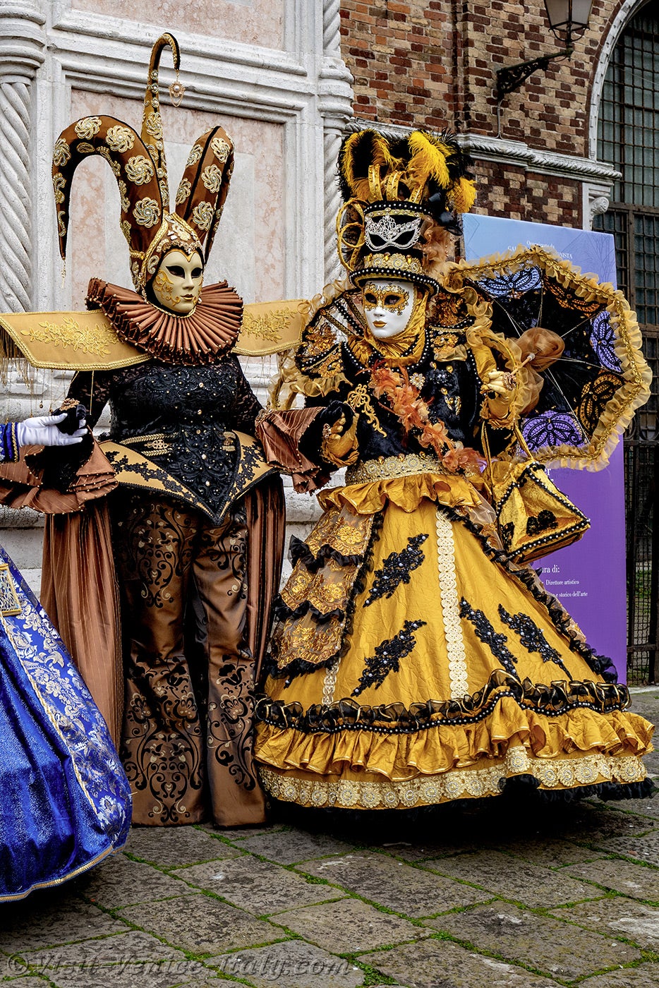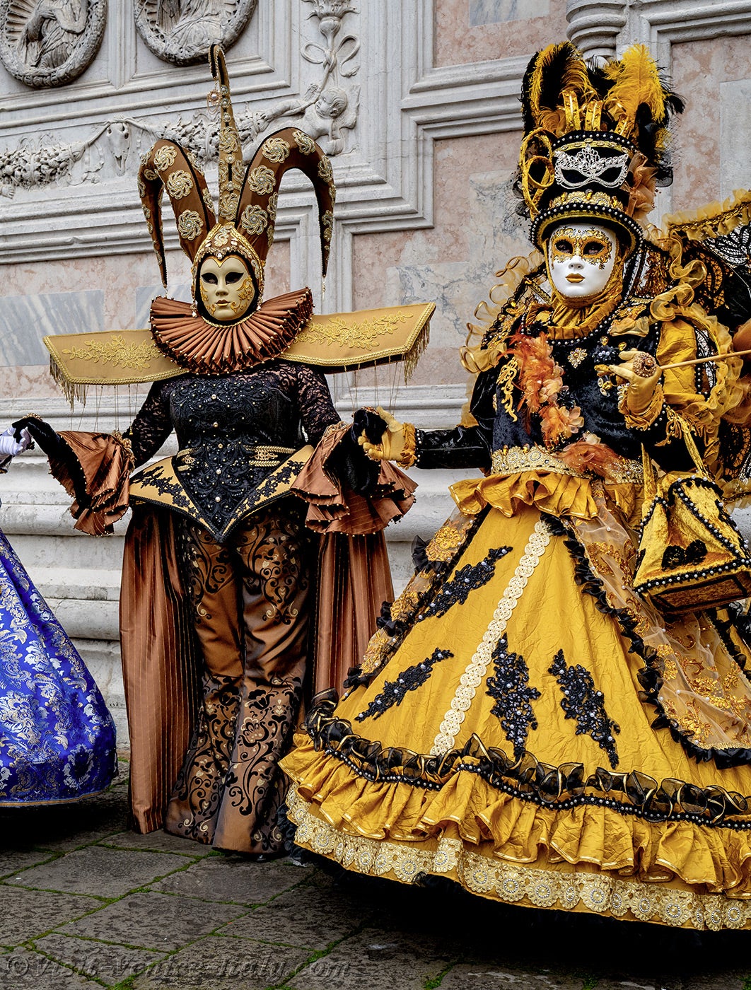 The gold and azure of the costumes mingled on the Campo San Zaccaria during this Venice Carnival 2026.Headdresses as varied as they were original, tricorns, spikes and feathers sublimated dresses of sumptuous fabrics adorned with broderies.
