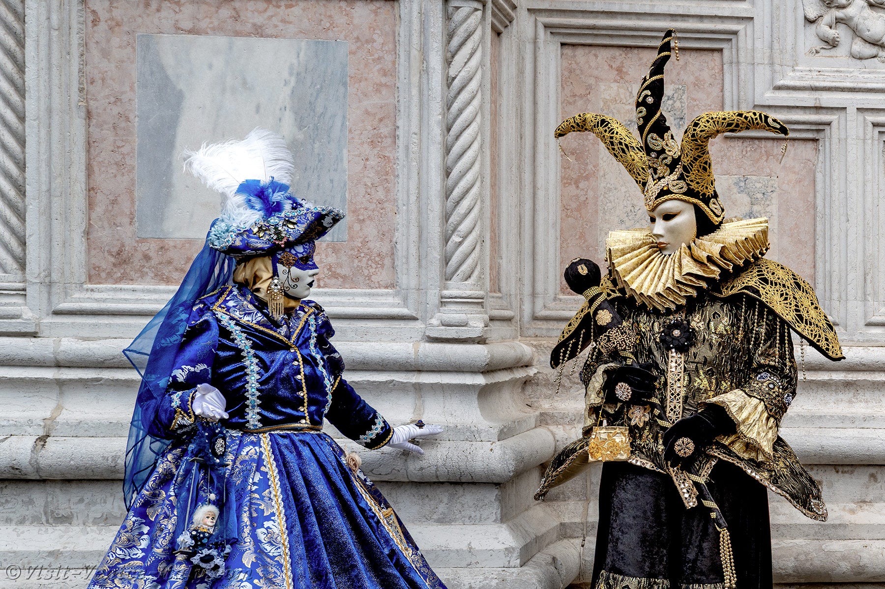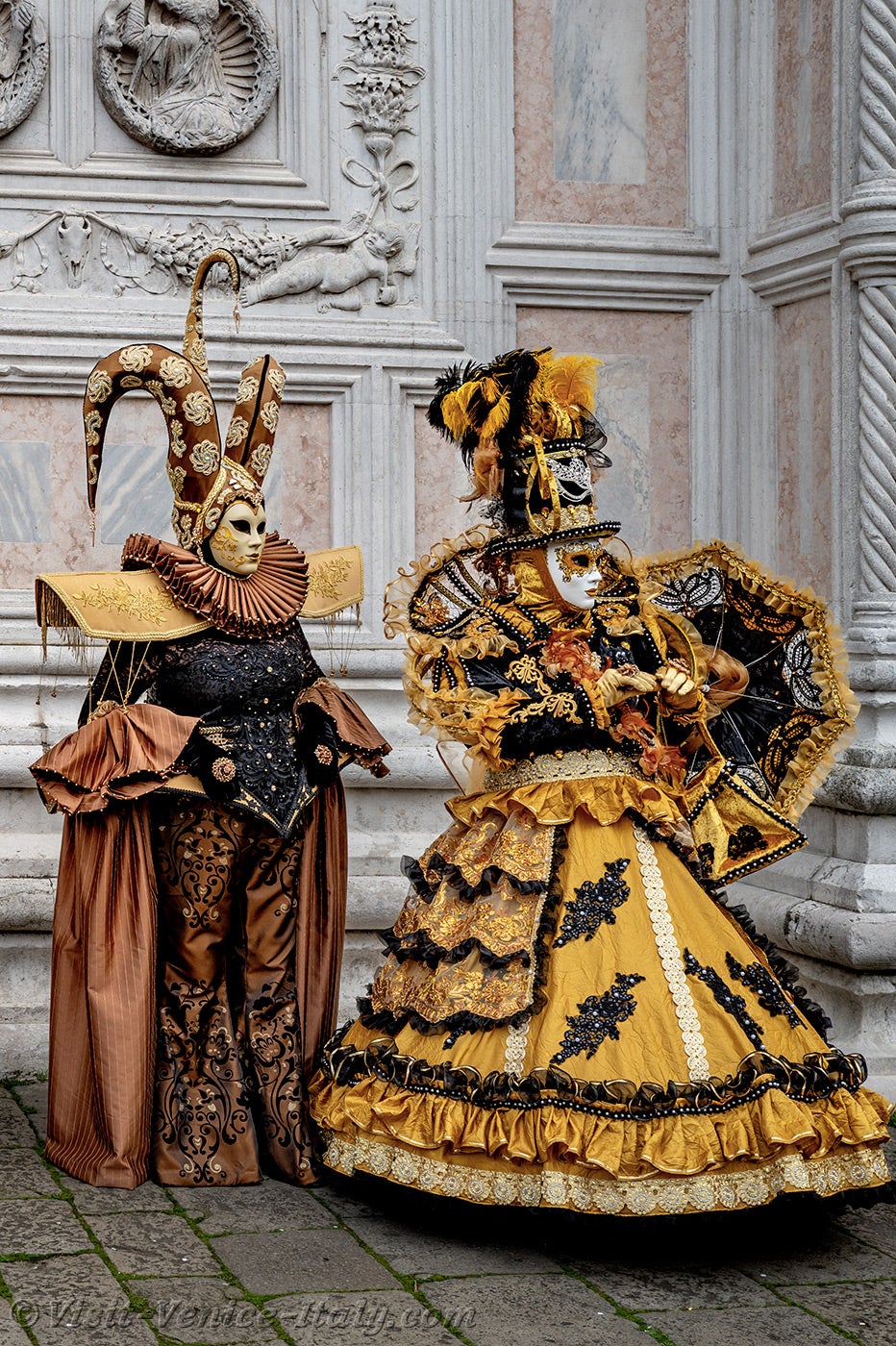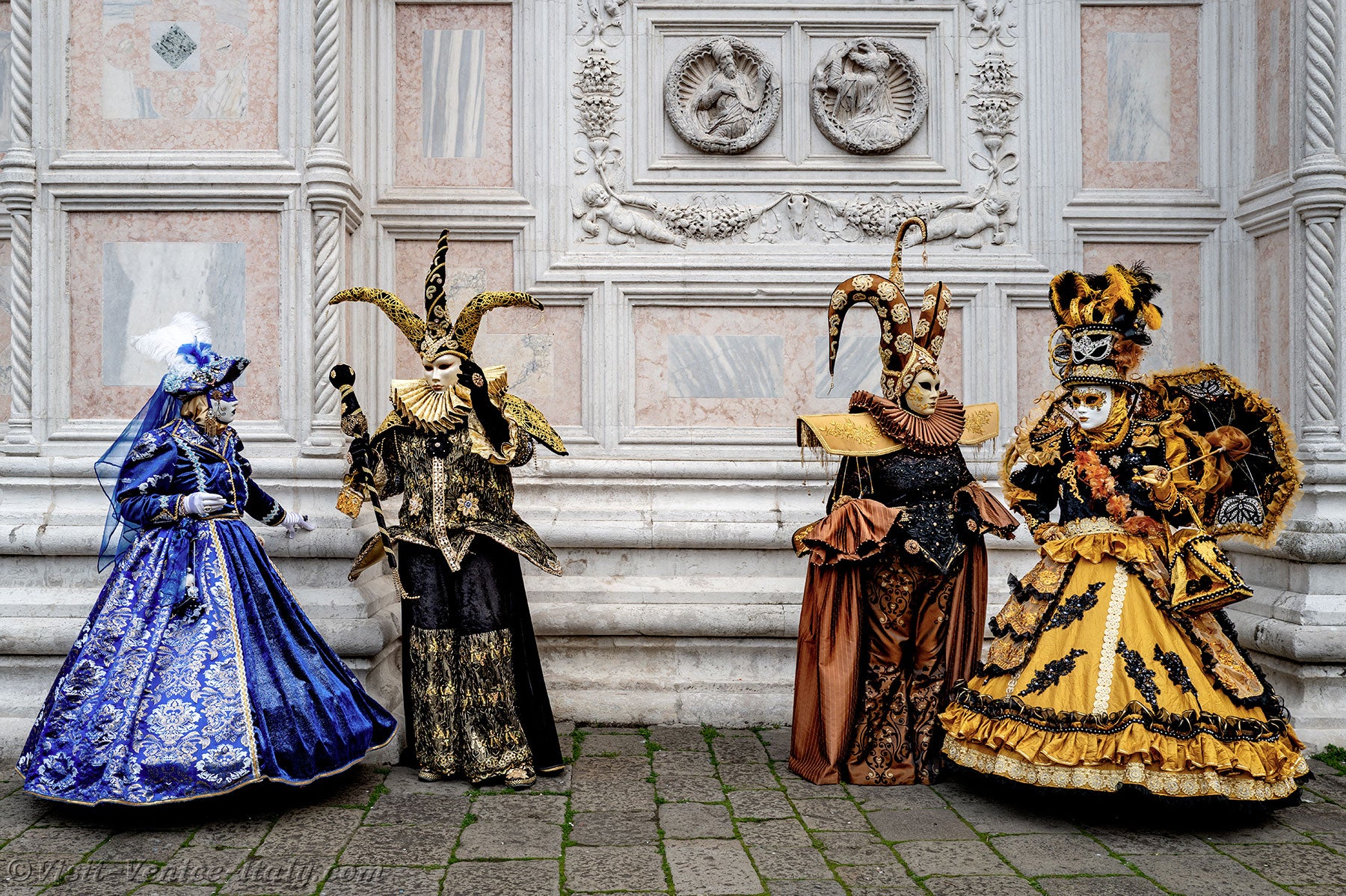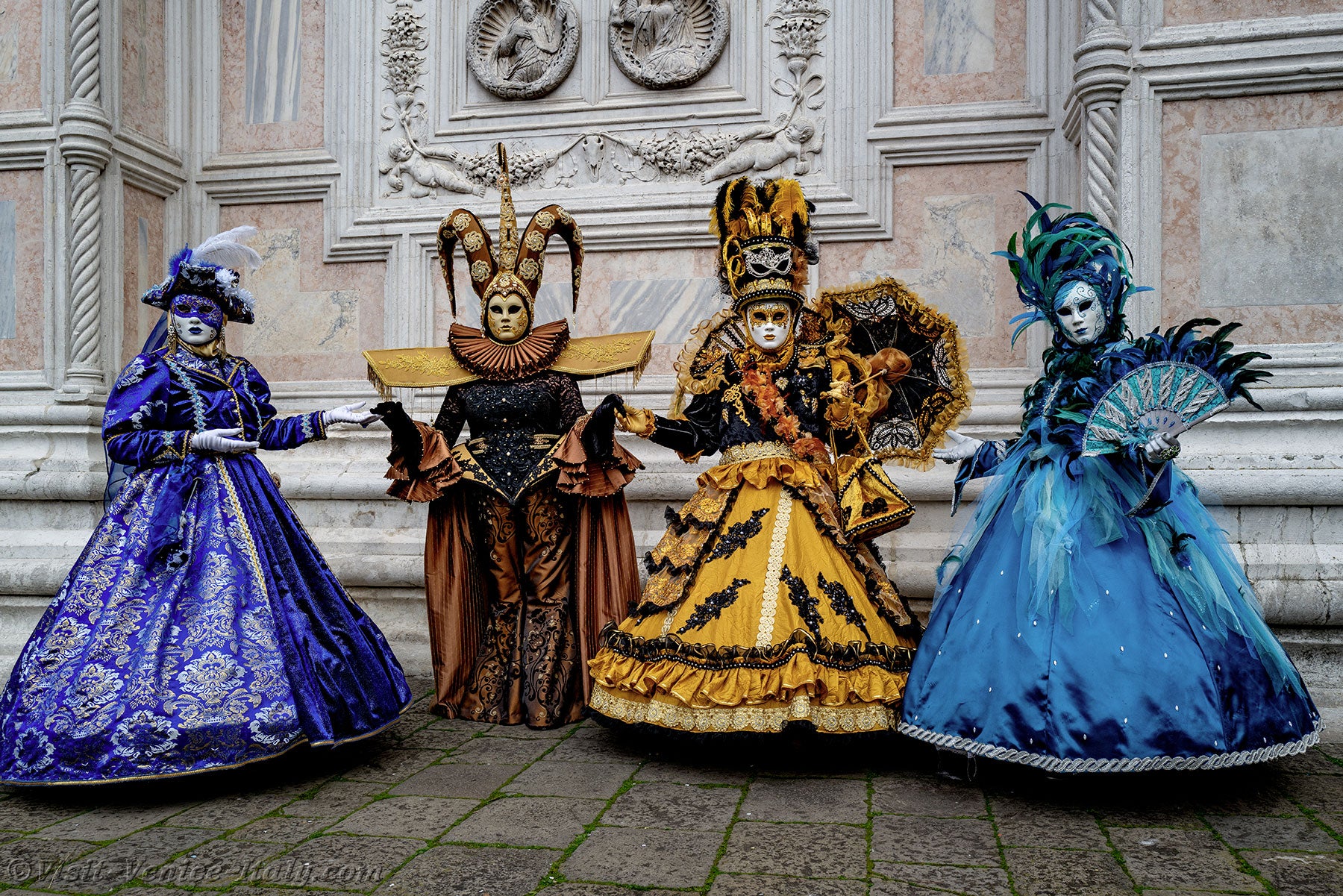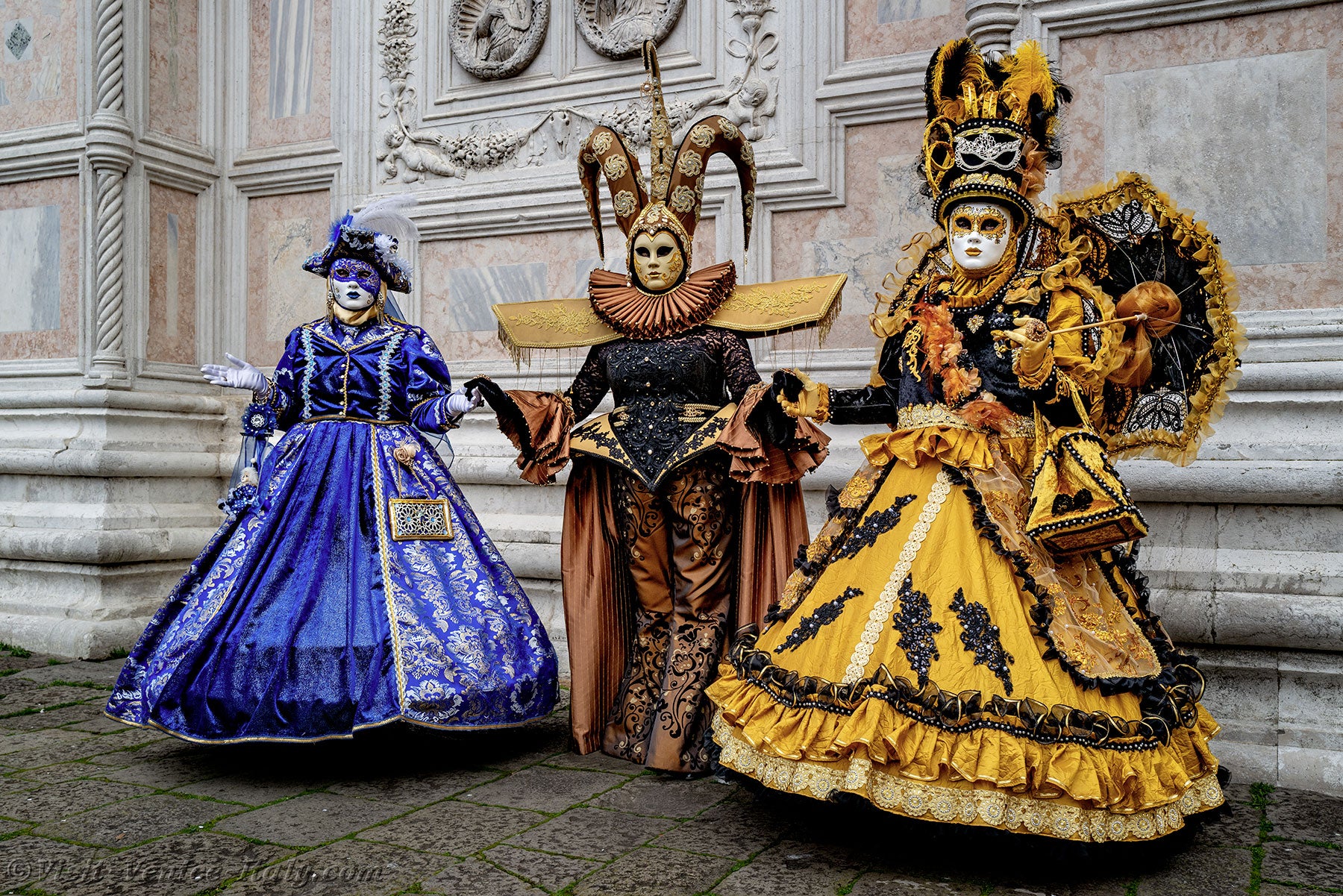 The gold and azure of the costumes mingled on the Campo San Zaccaria during this Venice Carnival 2026.Headdresses as varied as they were original, tricorns, spikes and feathers sublimated dresses of sumptuous fabrics adorned with broderies.