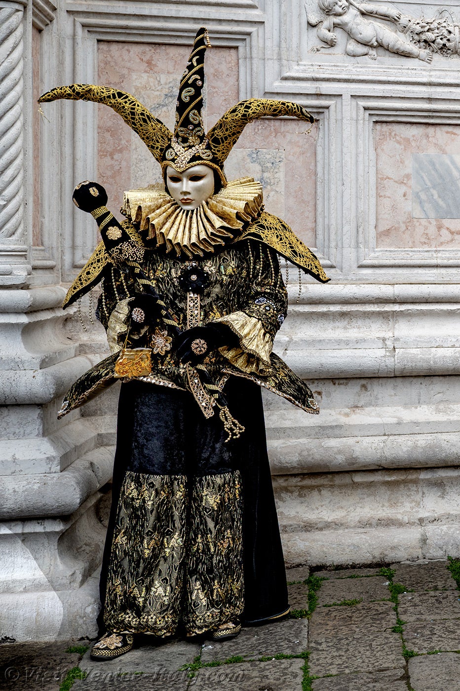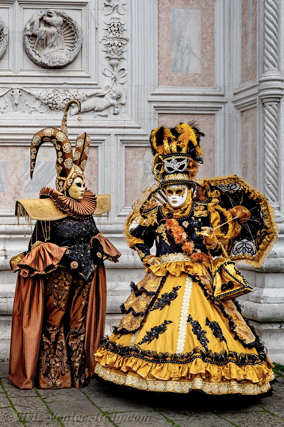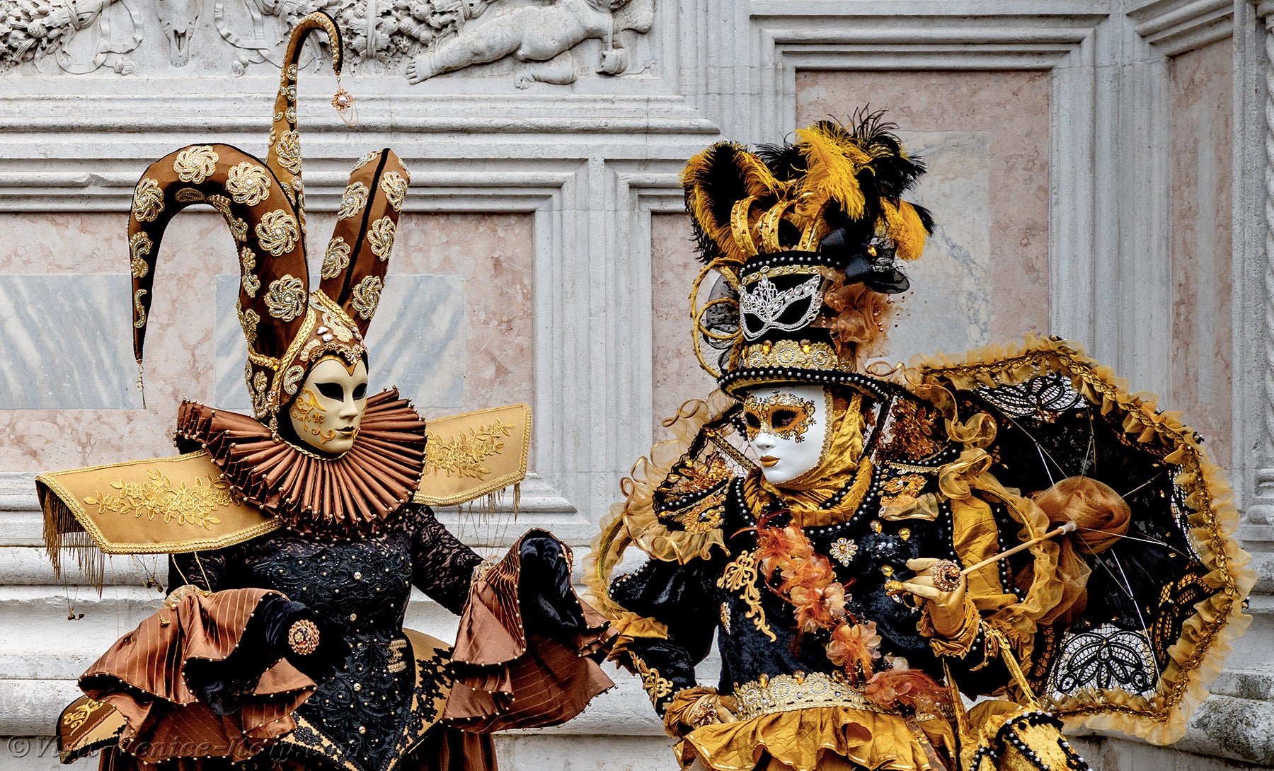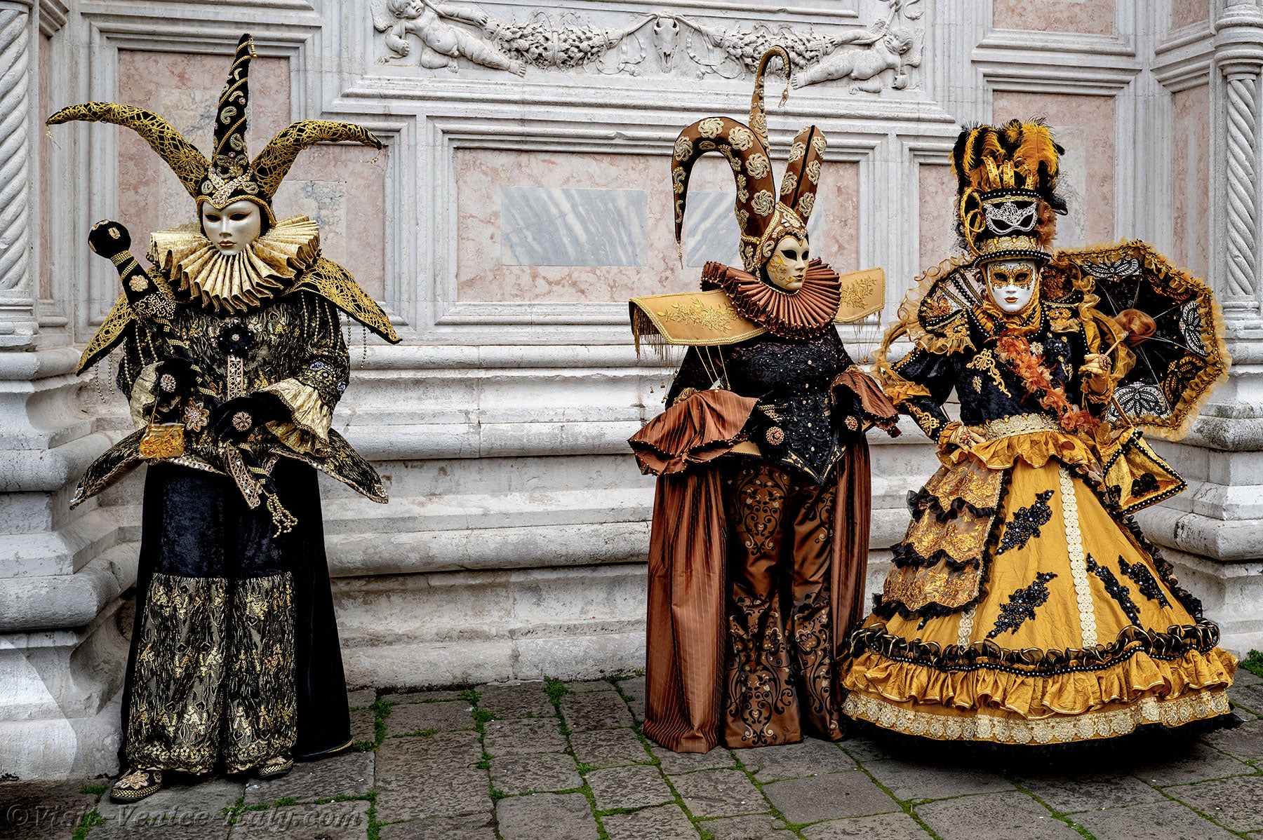The gold and azure of the costumes mingled on the Campo San Zaccaria during this Venice Carnival 2026.Headdresses as varied as they were original, tricorns, spikes and feathers sublimated dresses of sumptuous fabrics adorned with broderies.