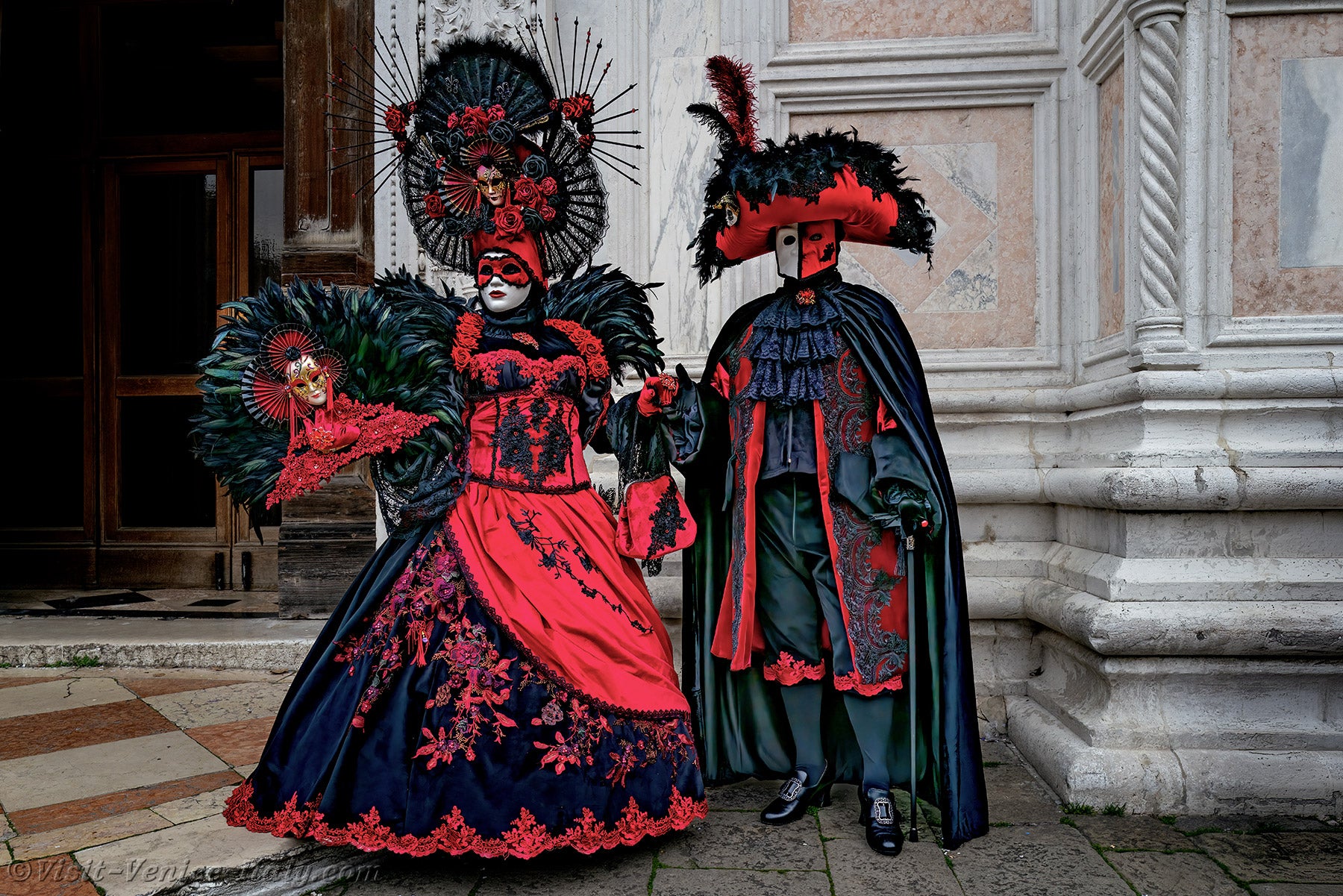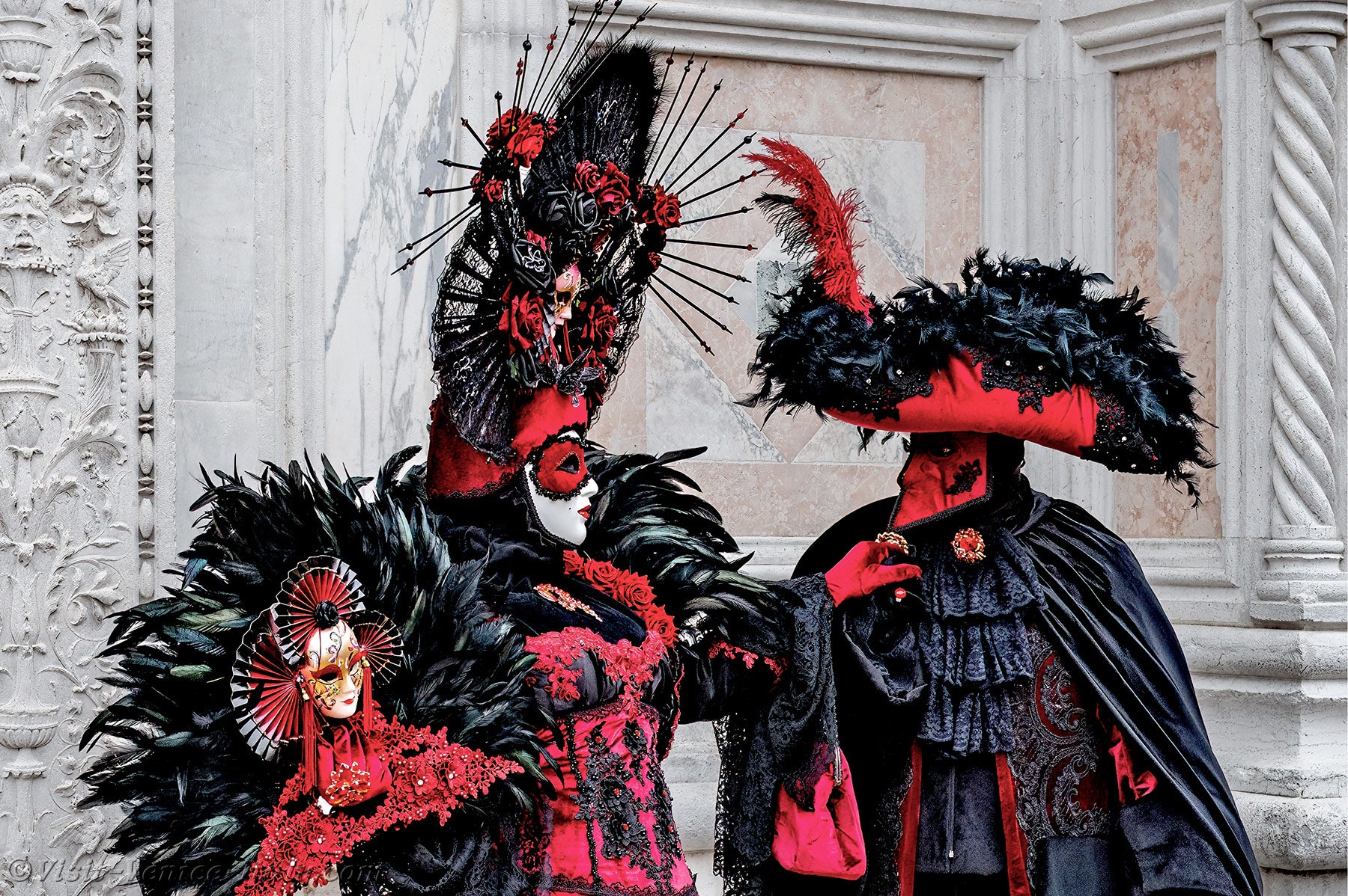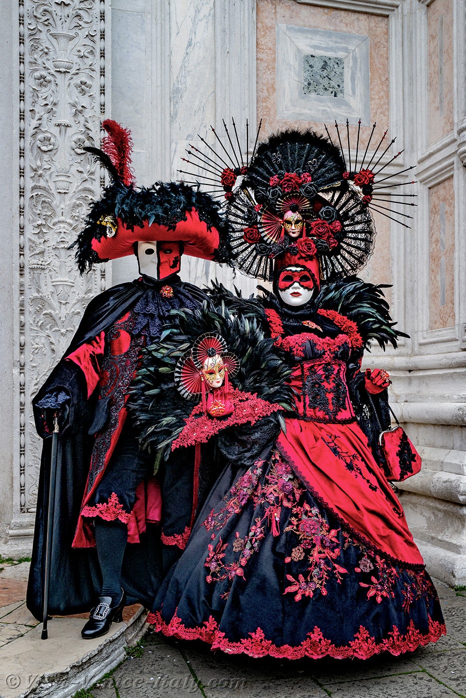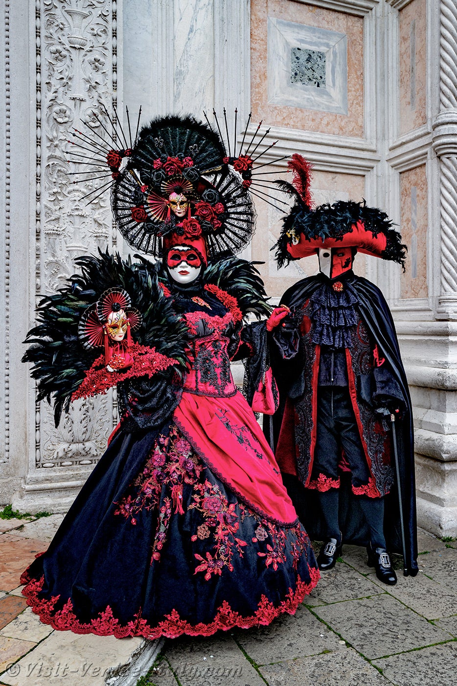 A beautiful couple, dressed in red and black, with long iridescent feathers of deep green, stepped forward.The lady, dressed in a dress adorned with flowers, held out her hand to her knight in shining armour so that he could kiss it.