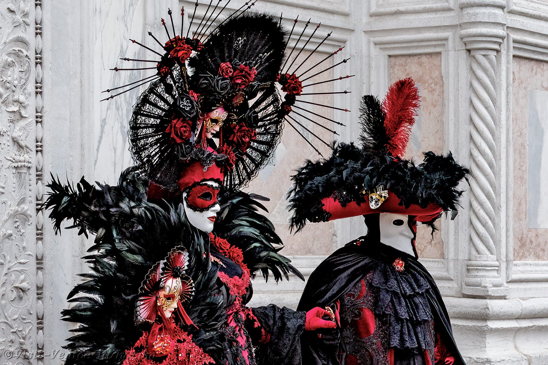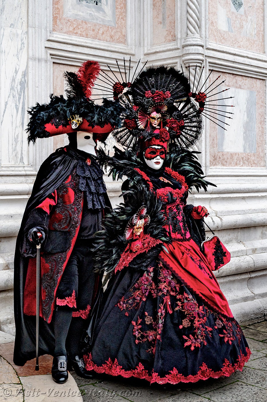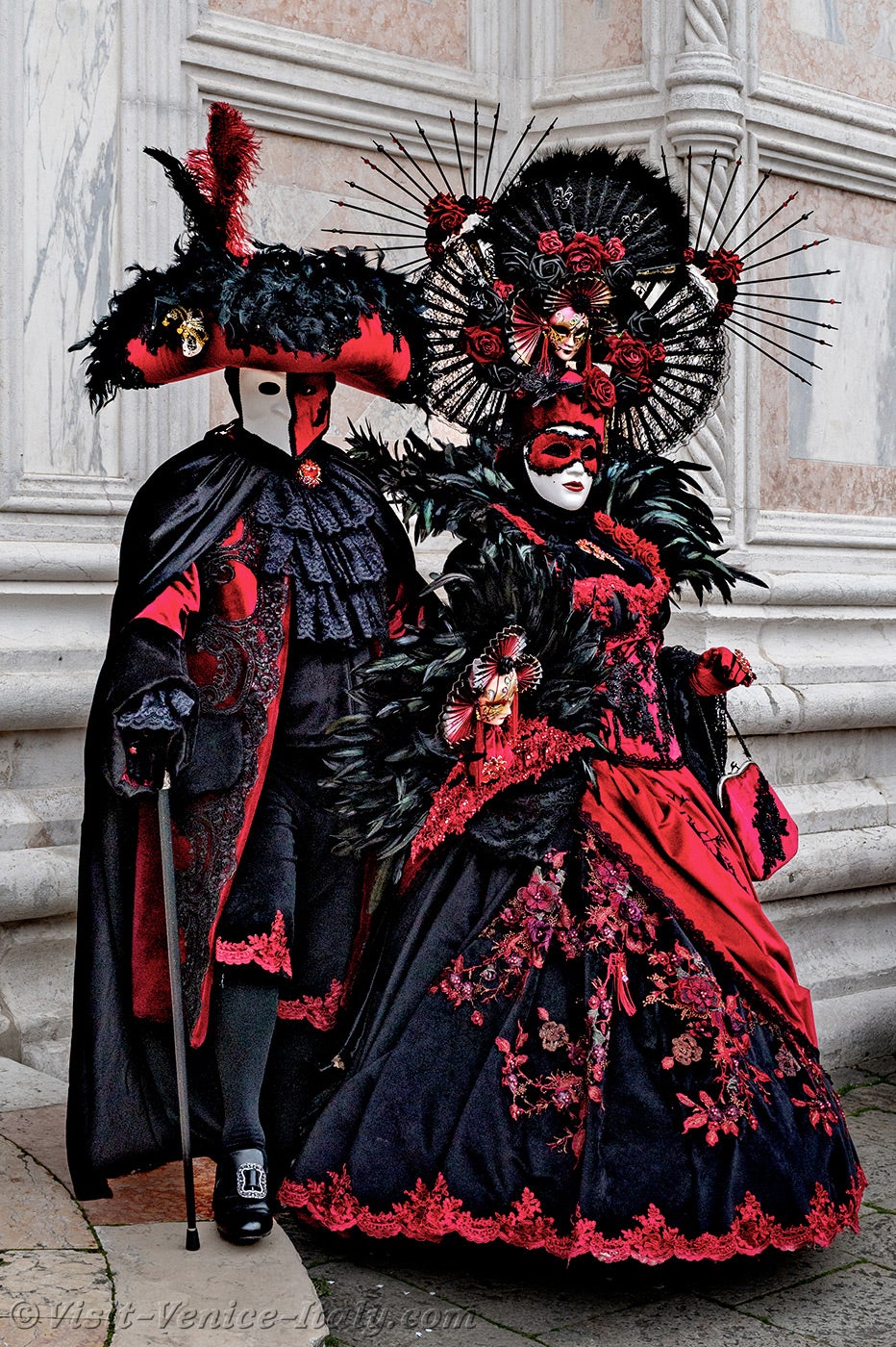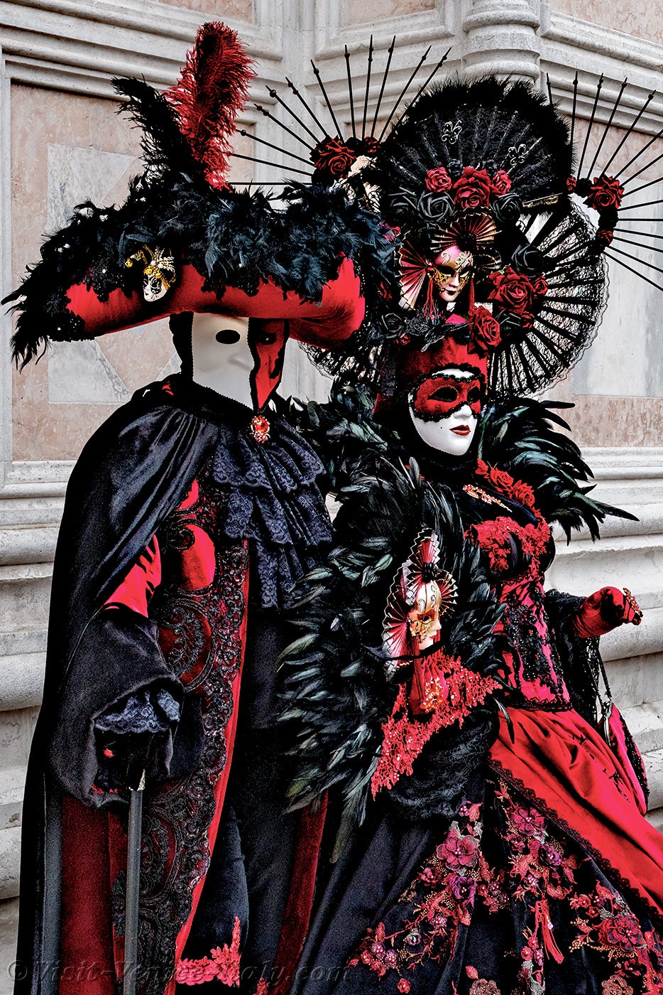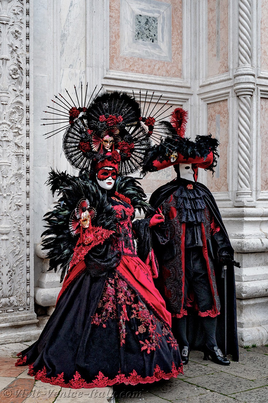 A beautiful couple, dressed in red and black, with long iridescent feathers of deep green, stepped forward.The lady, dressed in a dress adorned with flowers, held out her hand to her knight in shining armour so that he could kiss it.