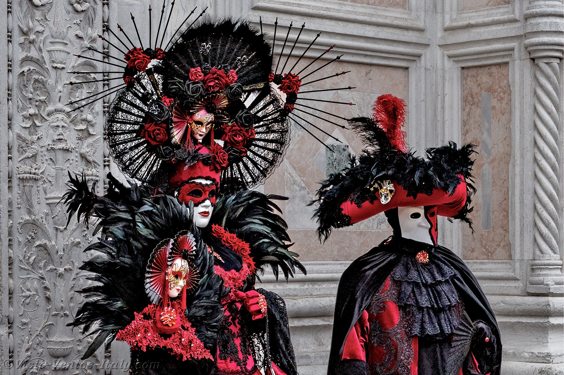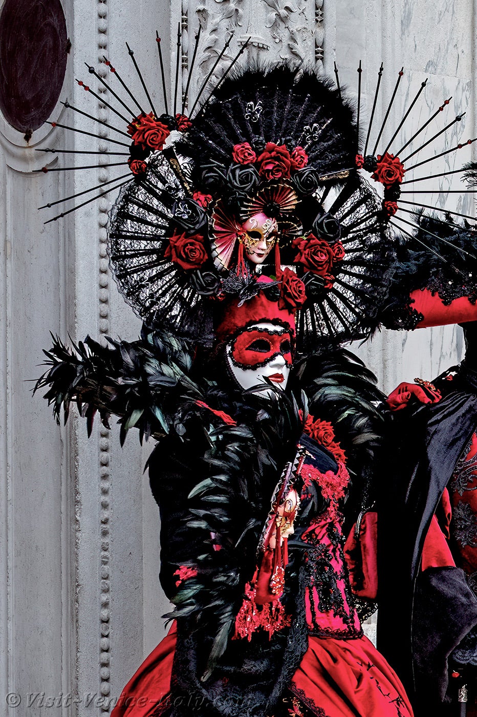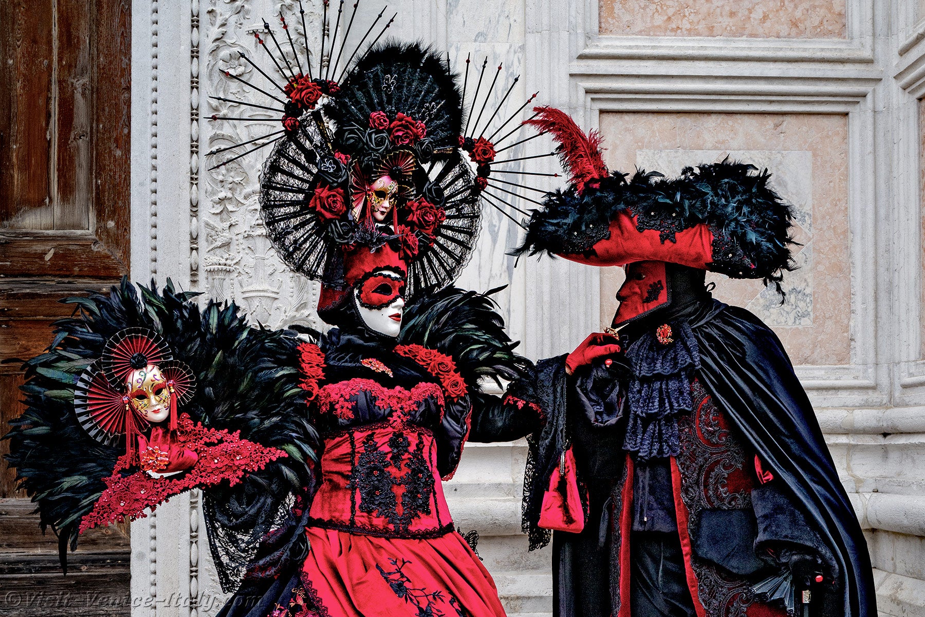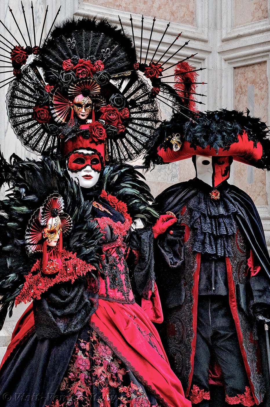 A beautiful couple, dressed in red and black, with long iridescent feathers of deep green, stepped forward.The lady, dressed in a dress adorned with flowers, held out her hand to her knight in shining armour so that he could kiss it.