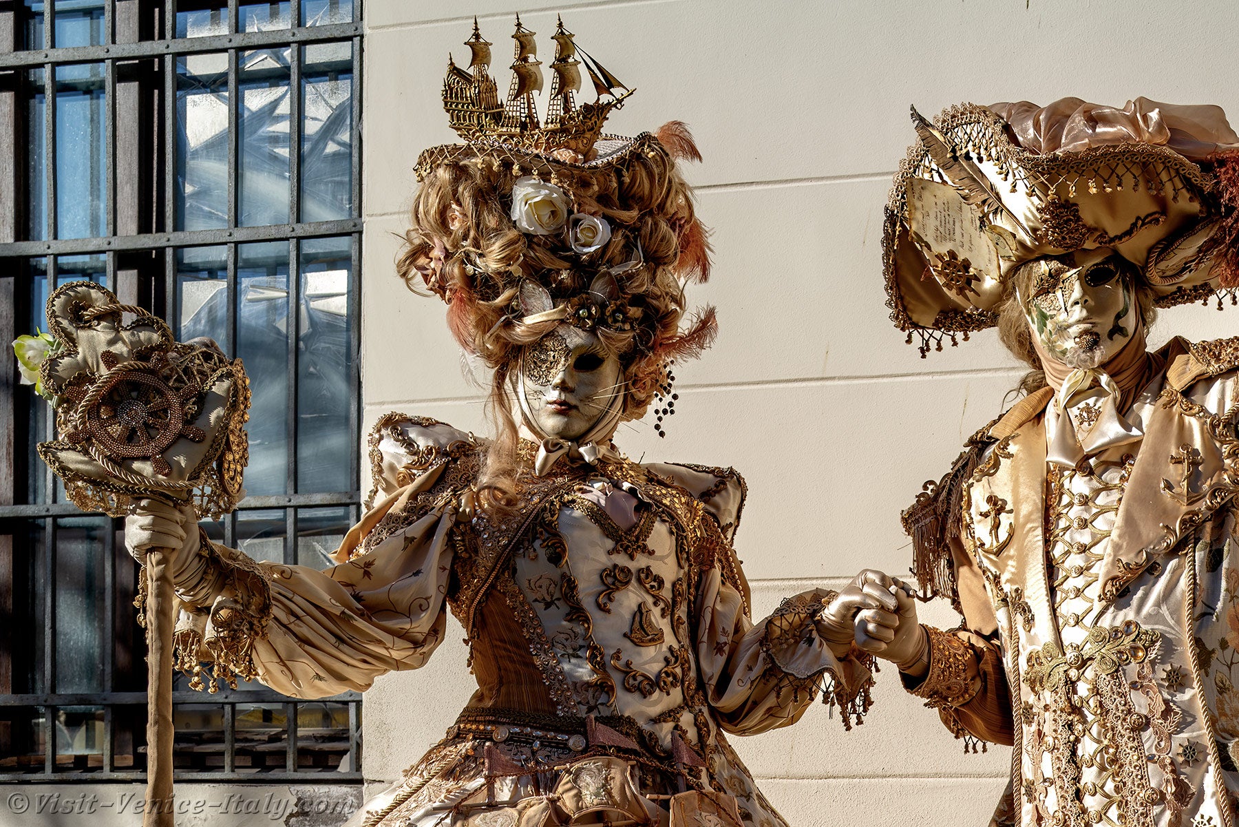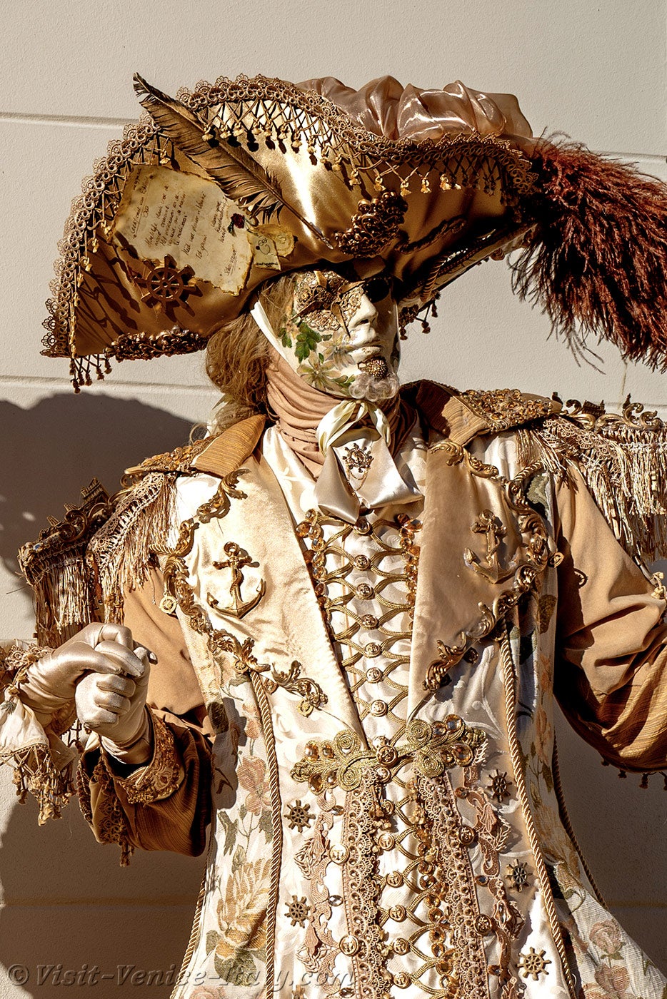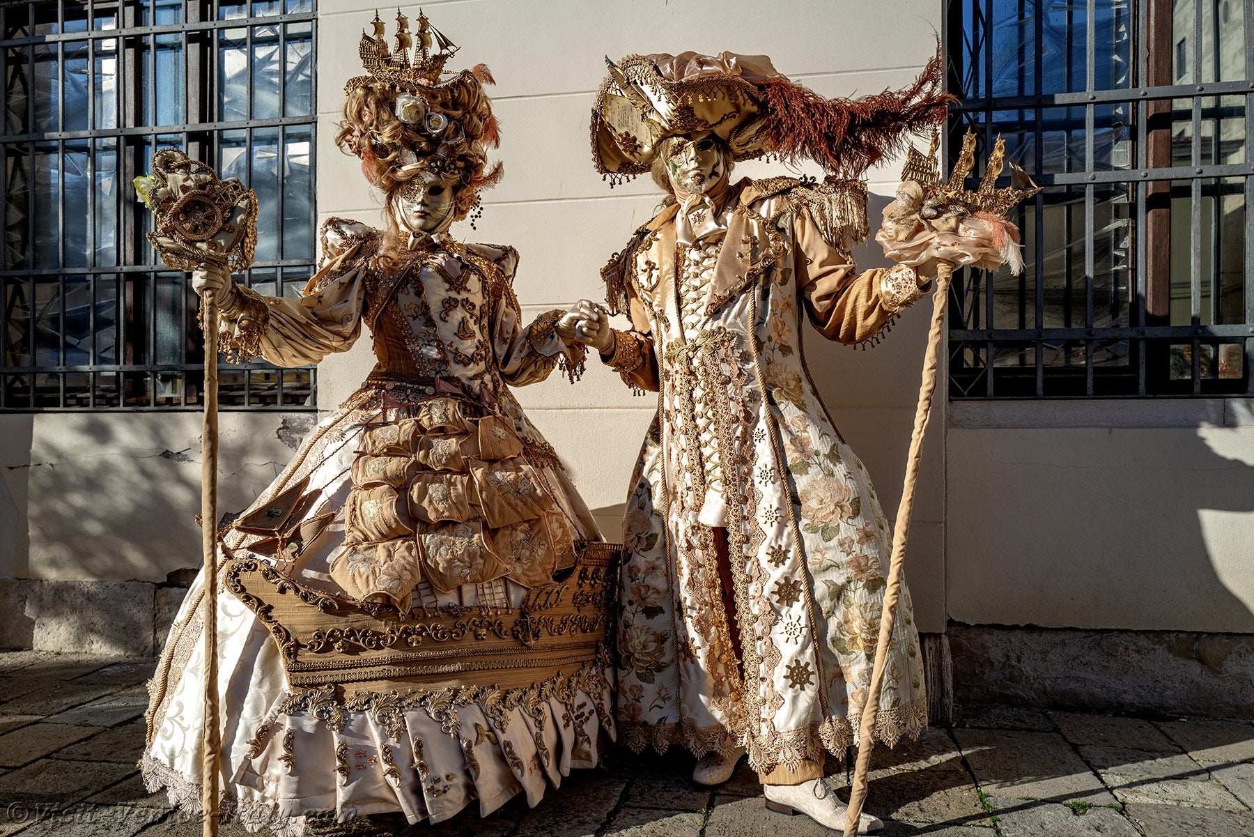 The beauty of the embroidery, the harmony of the colours and the creativity of the costumes of these two pirates were enough to make theatre costume designers, but also those of the cinema, drool with envy.The lady's dress adorned with a big pirate ship added the finishing touch to this work of art.