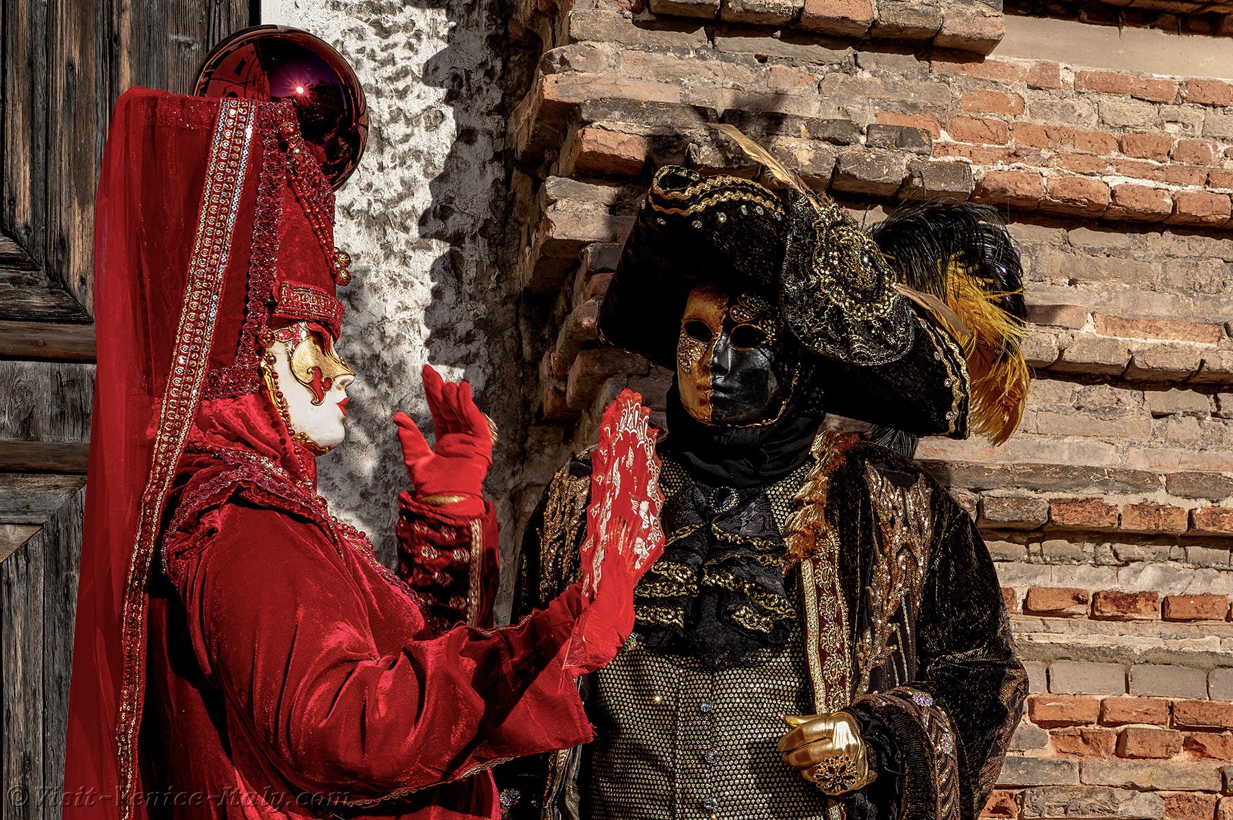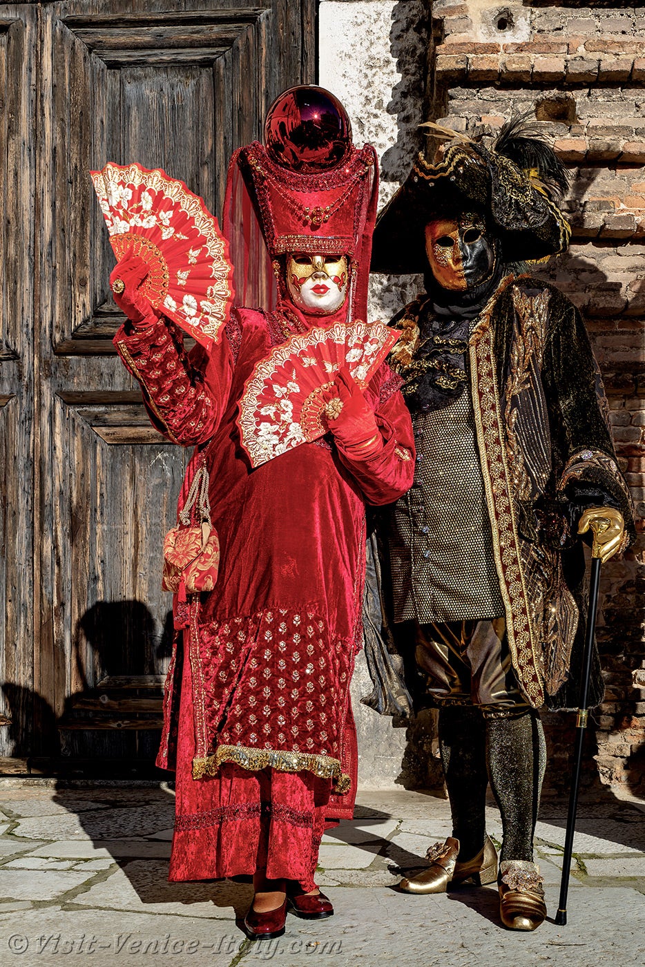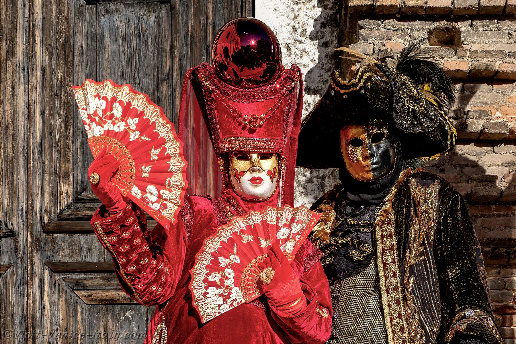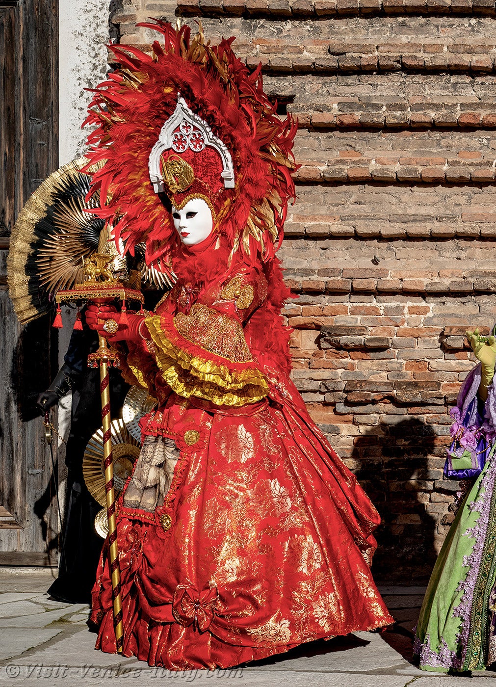 Venetian nobility was in the spotlight, and the ladies' red dresses lit up the square in front of San Lorenzo church.This magnificent lady in red, with her headdress adorned with the lion of St. Mark, could only be the dogaress, the wife of the Doge of Venice.